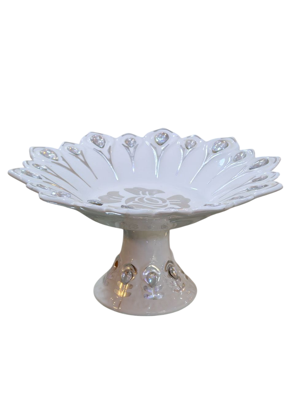 decorative ceramic serving stand or fruit bowl on a pedestal base. Its design, featuring a scalloped edge and a pearlescent white glaze with subtle silver/gold details, is characteristic of items used for serving fruits, desserts, or as an elegant centerpiece.
