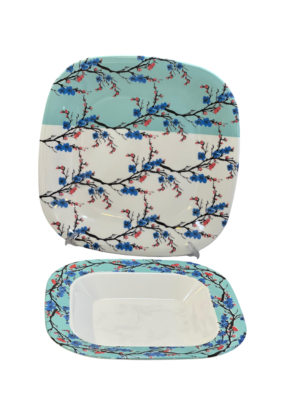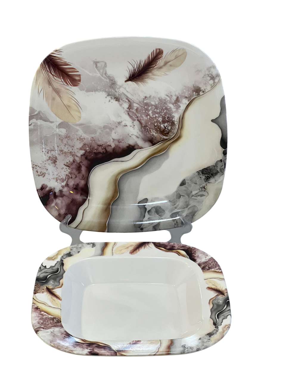 This is a set of pure melamine dinnerware with a marble and feather design.