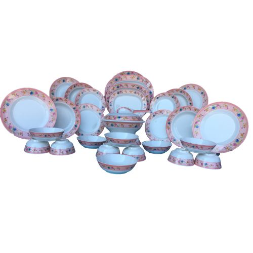 Design: The dinnerware features a classic white base with a vibrant pink and green floral border design. The set includes a variety of pieces, such as flat plates, deep plates, bowls, cups, saucers, serving platters, and a lidded serving dish.