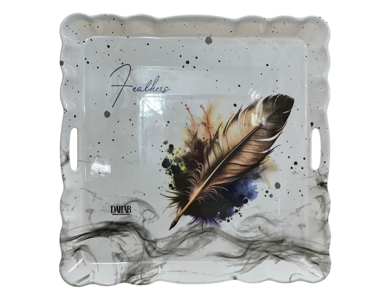 Design: The tray features a modern design showcasing a large feather painted in watercolor (brown, blue, yellow) on a white background with black flecks and a black smoke effect at the bottom. The edges of the tray are decorative and wavy.