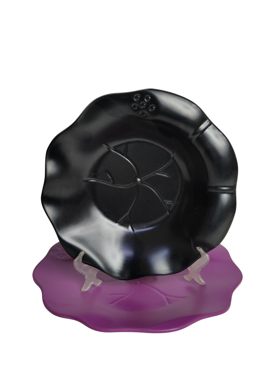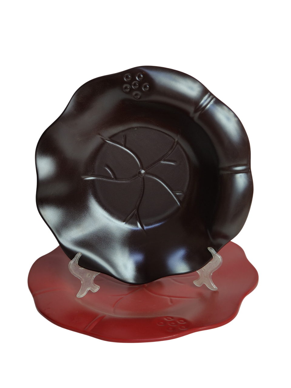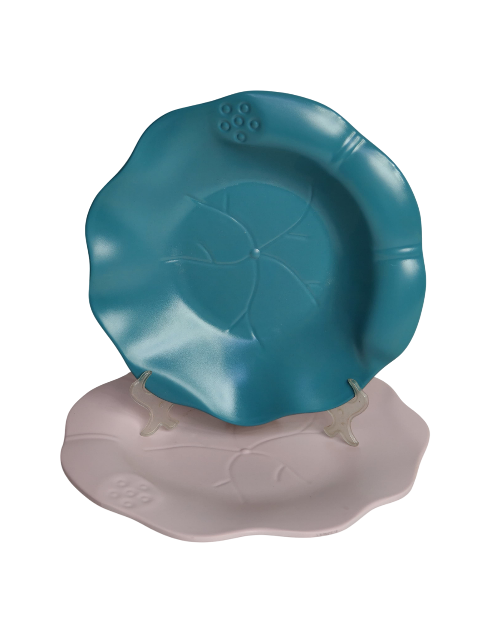 Melamine dinnerware sets are typically used as dinner plates. They feature a decorative rim and an embossed leaf pattern that mimics natural forms, such as a lotus flower or other botanical design.
