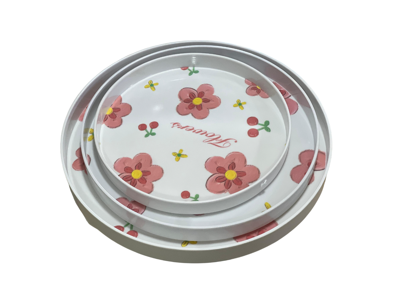 Este producto es un juego de bandejas de melamina para servir, que se vende en un conjunto de cuatro piezas entrelazadas con un diseño floral. Estas bandejas están diseñadas para un uso práctico diario y para servir comida a los invitados con estilo.