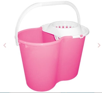 The plastic mop bucket shown is a popular floor cleaning product, featuring a practical design and light pink color with a white plastic handle and wringer.