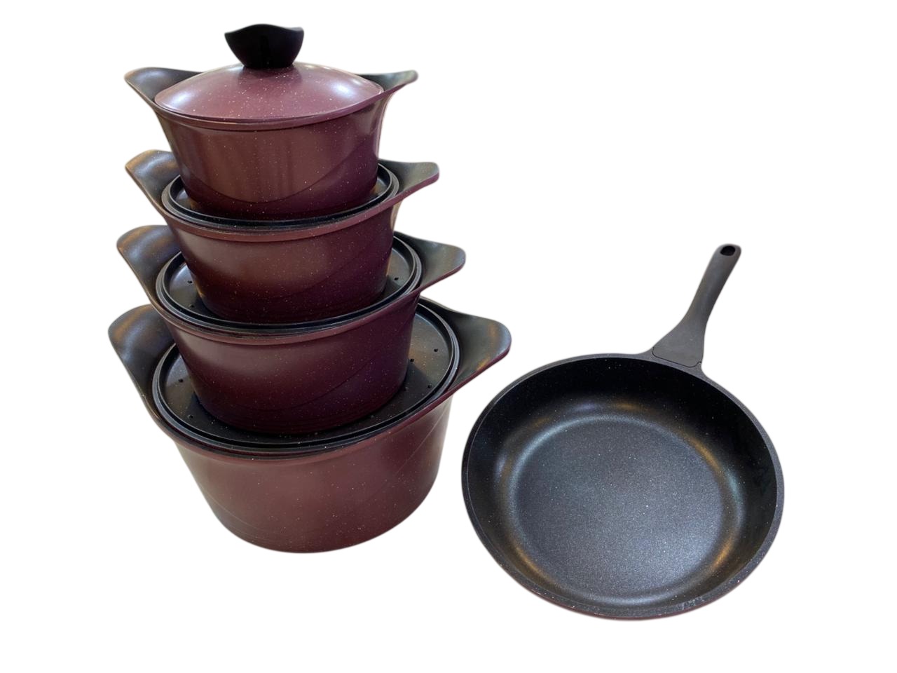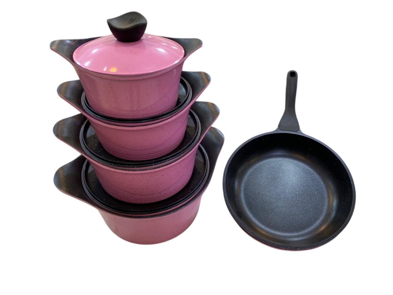 granite non-stick set, very similar in design and features to the Neoflam Aeni or Master El-Zenouki brands. The pots are a distinct pink or rose color, with contrasting black handles and lids.