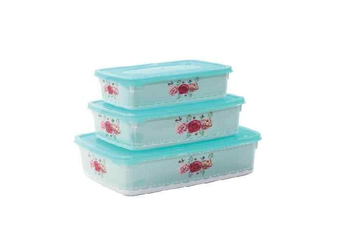 set of four rectangular plastic food storage containers with light green lids and a red floral pattern.