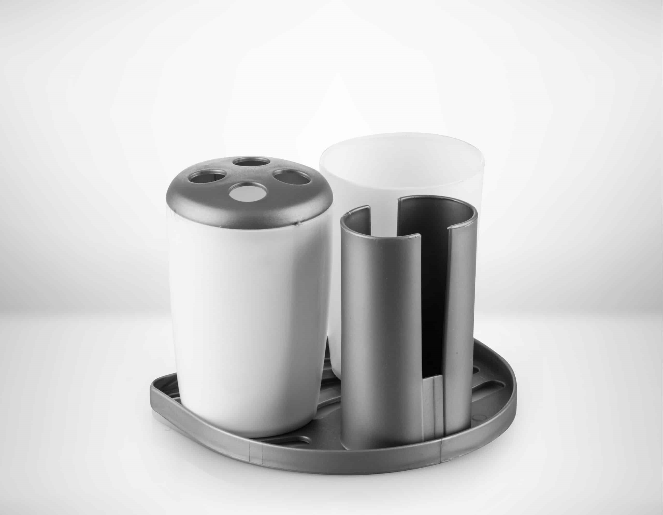 Contents: Typically includes an oval base, two cup holders (one with a lid containing toothbrushes), and a designated space for toothpaste.