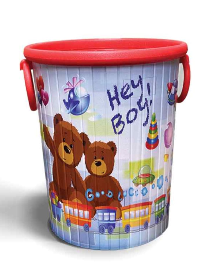 Design: It features a vibrant, colorful graphic that is part of the plastic molding process (IML technology), meaning the design will not peel or fade easily. The bin has a wide opening and integrated handles for easy carrying.