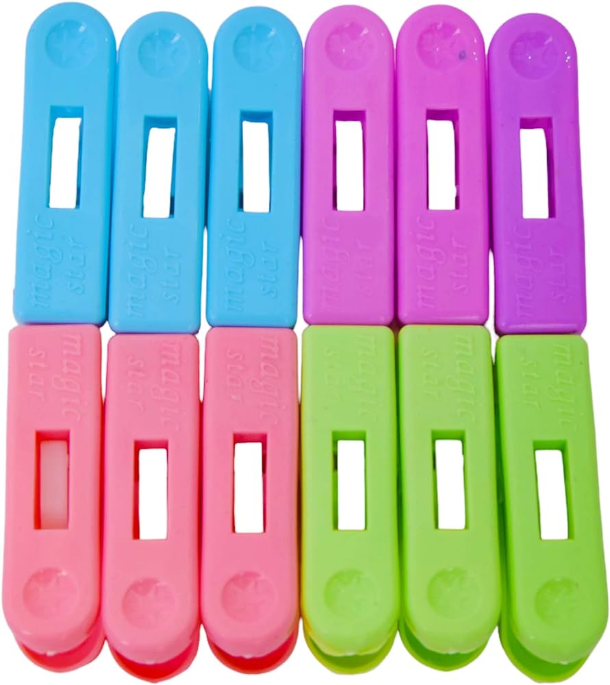 plastic clothespins (also known as clothes pegs or laundry clips), and some sources indicate the specific brand name is “Magic Star”. These small, colorful plastic clips are versatile household items used for various purposes around the home, school, and office.