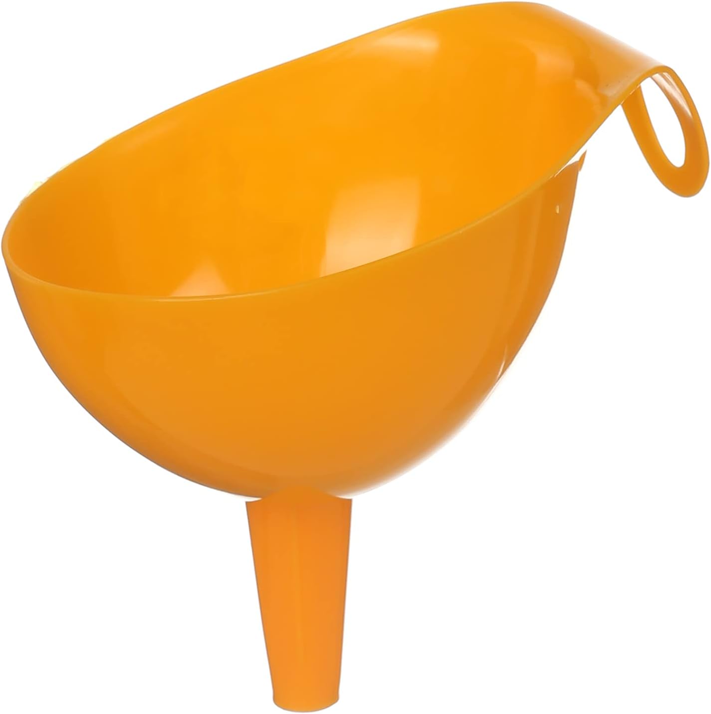 an orange plastic kitchen funnel, a practical multi-purpose tool used for transferring liquids or dry ingredients into containers with small openings. It is designed with a wide mouth and a handle for secure and easy use.