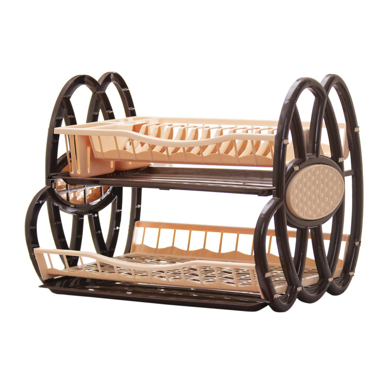a 2-tier plastic dish rack, also known as a dish drainer or dish organizer, designed for countertop use. It is typically made from durable polypropylene plastic with a decorative “rattan effect” or “arabesque” design on its side arches.