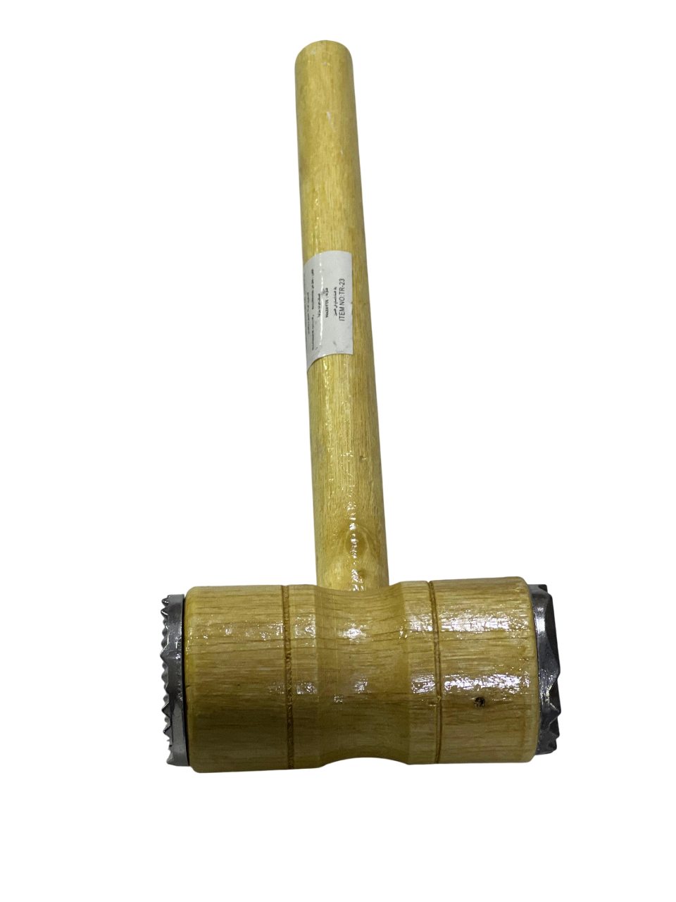dual-sided meat tenderizer hammer with a wooden handle and metal heads. This versatile kitchen tool is designed for pounding and tenderizing various cuts of meat.