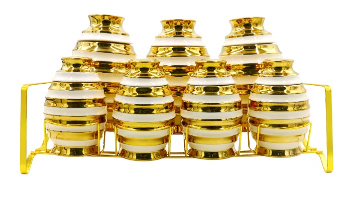 Set Contents: The set includes 7 ceramic jars (typically 3 large and 4 small) and a matching gold-plated metal stand.