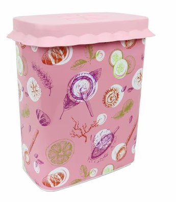 Design: The box is a light pink color with a decorative print featuring images of various spices, fruits (like oranges and cucumbers), and culinary elements. It has a matching lift-off lid with a slightly ruffled edge design.