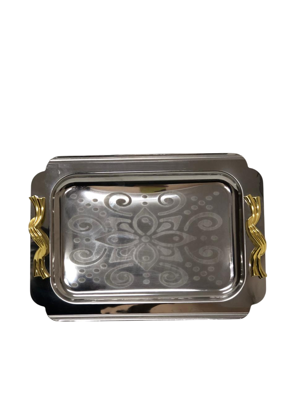 The image shows a luxurious rectangular serving tray, featuring a polished stainless steel design with gold-tone side handles.