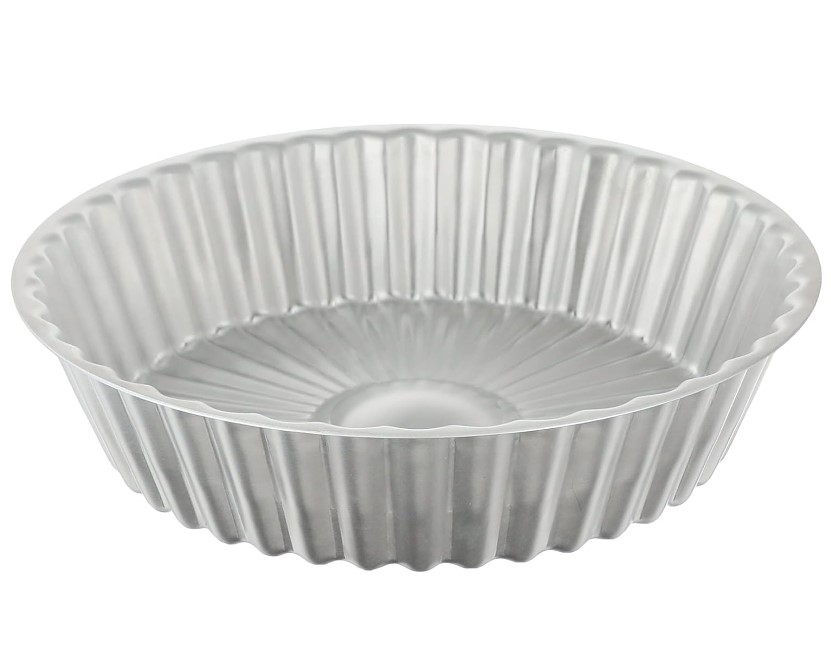 This aluminum brioche baking pan, also known as a ribbed cake pan or dessert pan, features a round design with scalloped (ribbed) edges and a flat base.