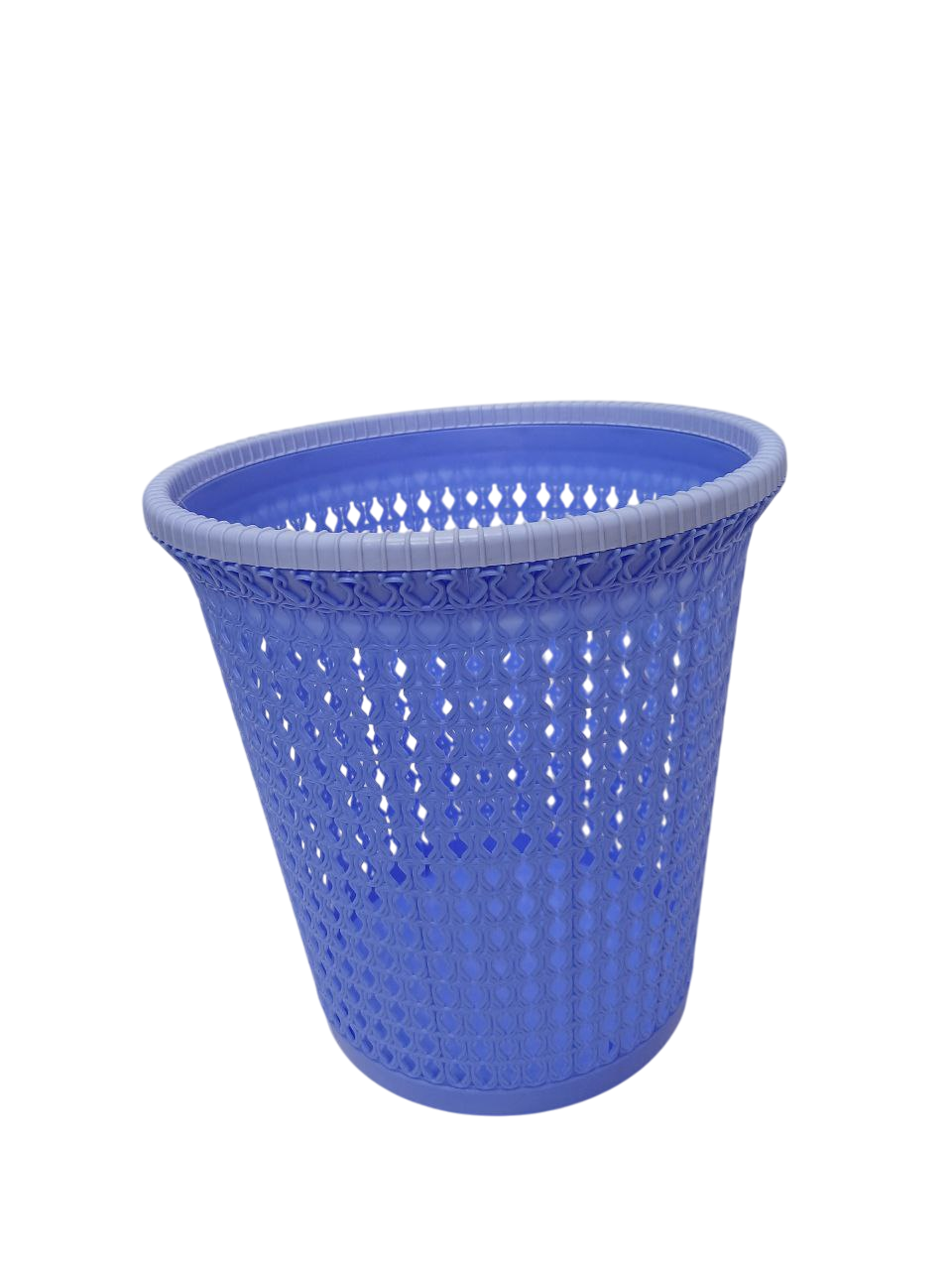 The plastic basket pictured is a perforated, or “lace,” plastic basket, commonly used as a wastebasket or for storage and organization.