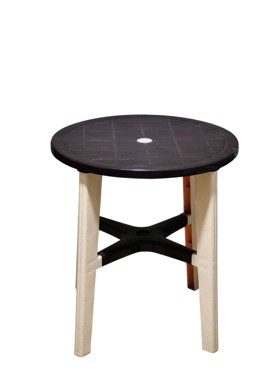 Design: A round table featuring a checkered top with a central opening for an umbrella. It comes with legs connected to a crossbar (X) at the bottom for added stability and durability.