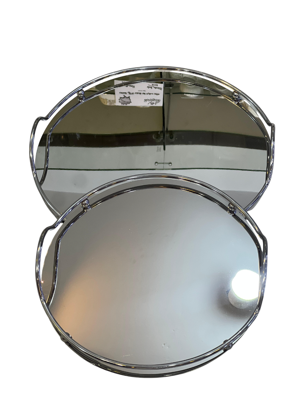 Oval serving trays with mirrored finishes, chrome or silver-plated handles, and a metal frame. These trays are suitable for decorative or serving purposes and are made of stainless steel.