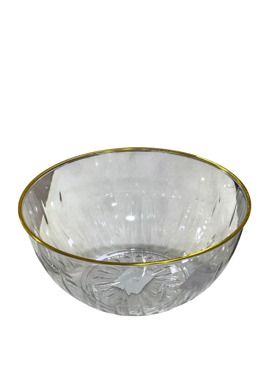 clear serving bowl with a decorative, etched pattern and a gold rim.