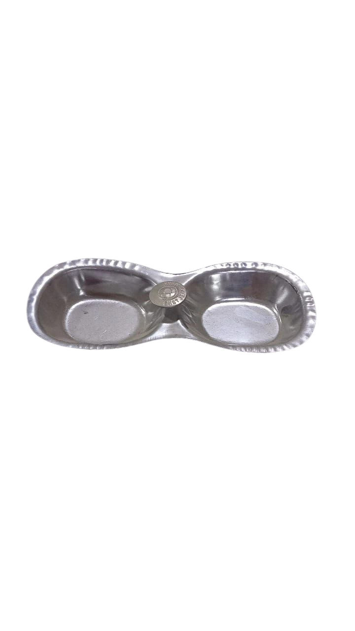 Function: This type of divided dish is designed to serve two different items separately, such as two kinds of snacks, condiments, or the traditional Indian powders haldi (turmeric) and kumkum (vermillion).