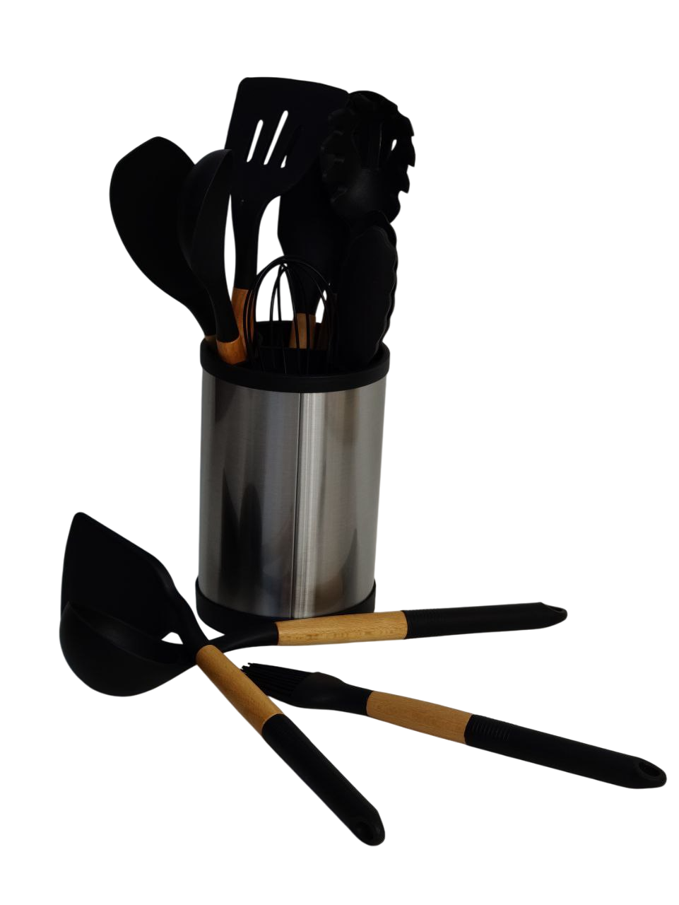 Components: A typical set like this ( 12 pieces) includes tools such as a spatula/turner, slotted spoon, solid spoon, soup ladle, pasta server, and a whisk, along with a storage stand.