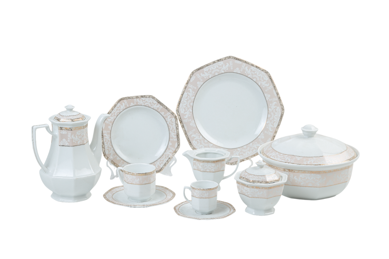 This item is a 72-piece octagonal china set in white with gold rims and an ornate frame.