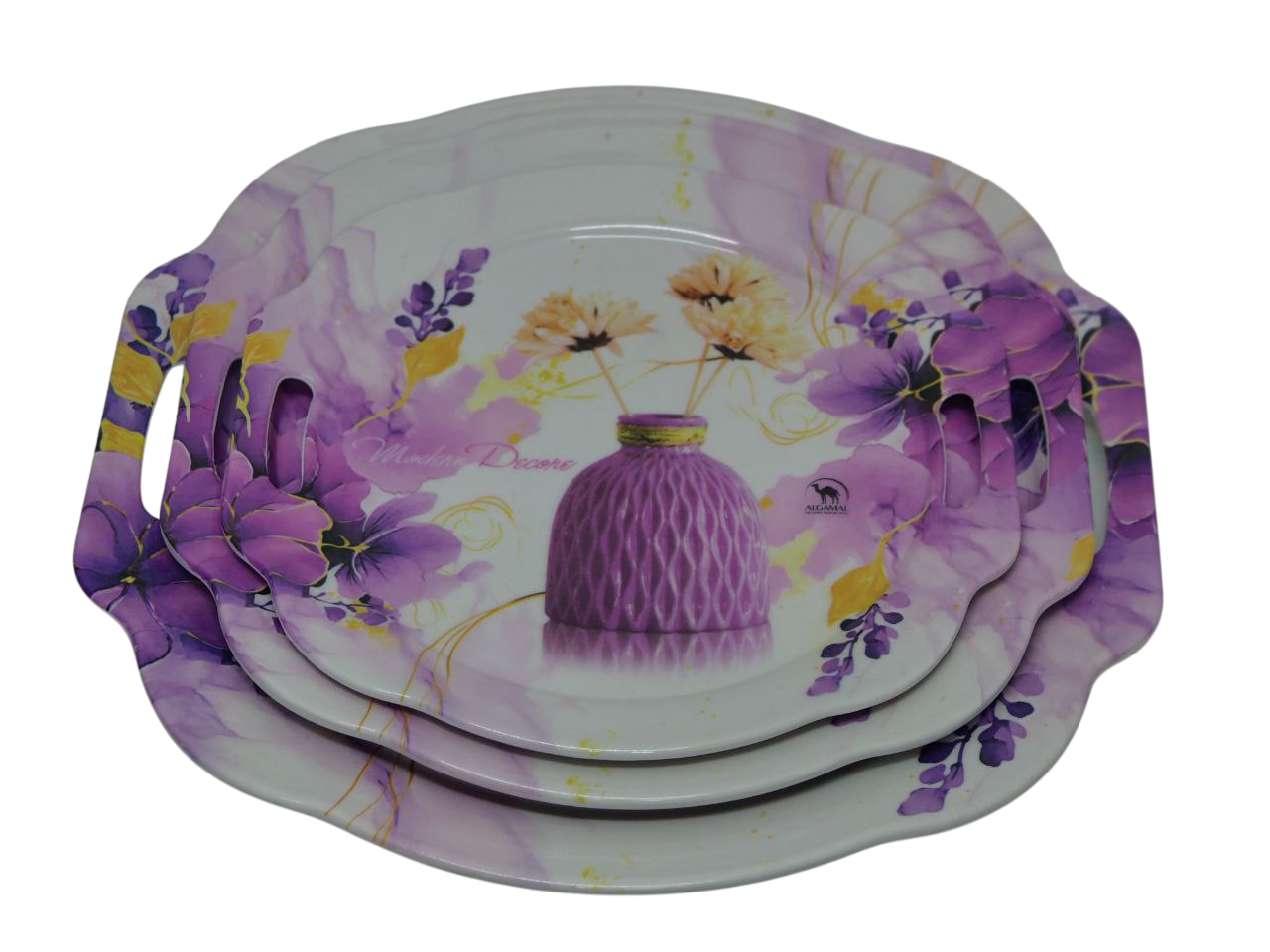 This melamine serving tray set typically consists of three pieces in graduated sizes and features a mauve floral pattern.