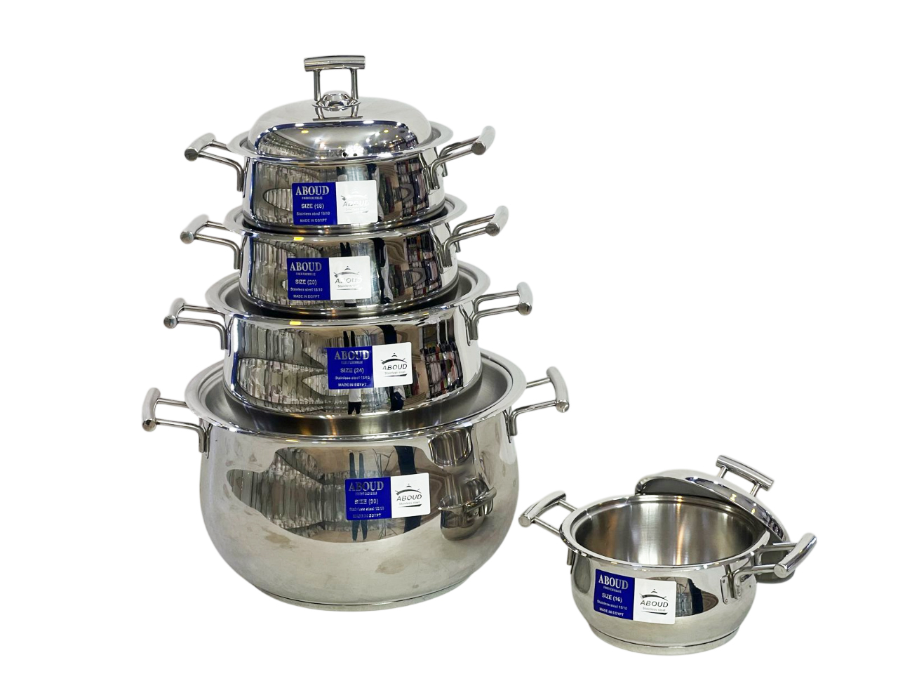 High-quality stainless steel cookware set, suitable for food use, known for its durability and even heat distribution.