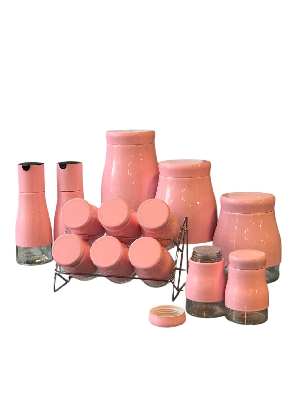 This product is a glass spice set with a pink exterior, designed to organize spices and liquids in the kitchen.
