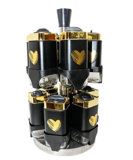 The image shows a rotating spice rack set, designed to organize and store various spices used in the kitchen. These sets are typically made from a combination of glass and stainless steel.