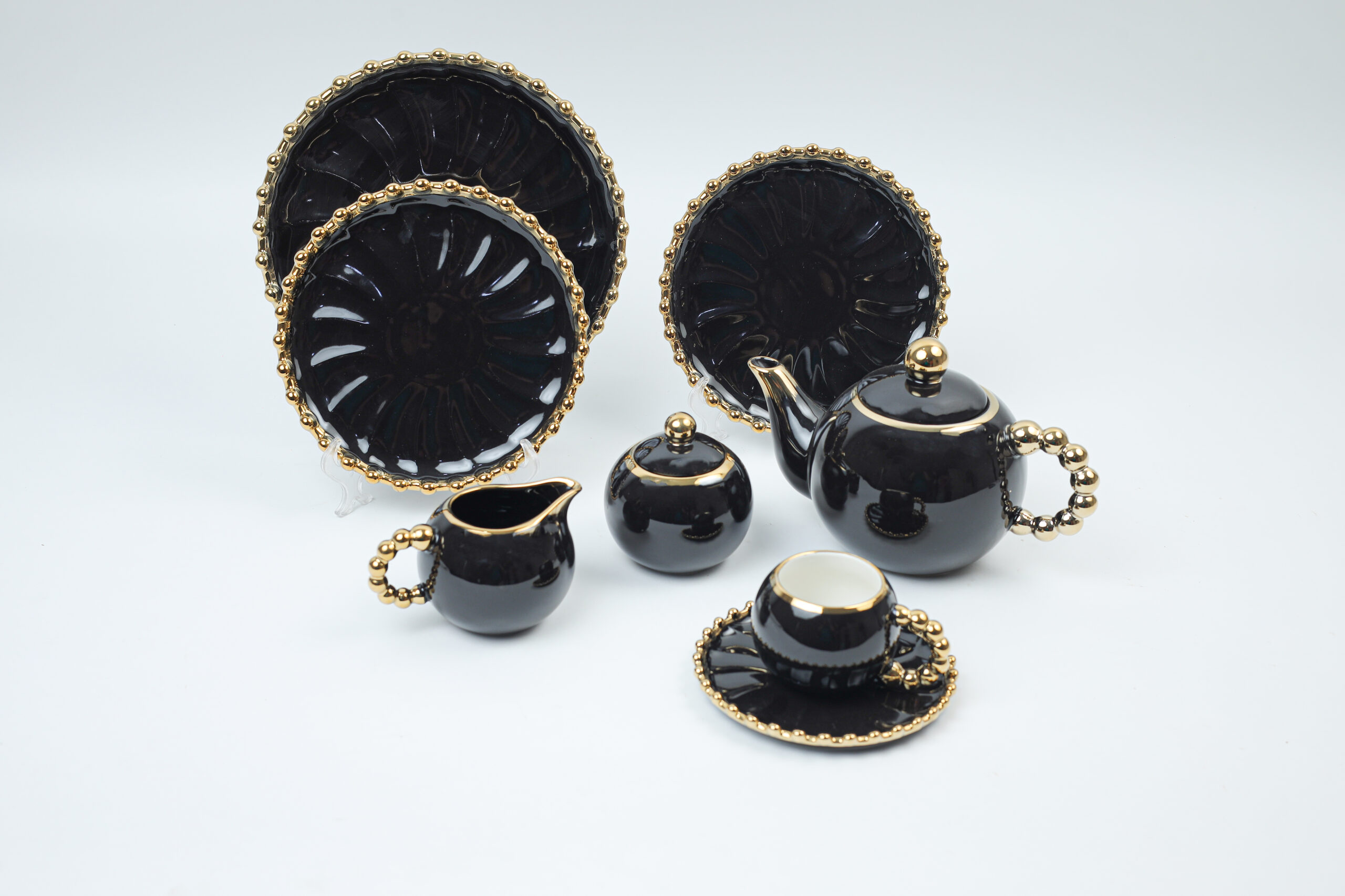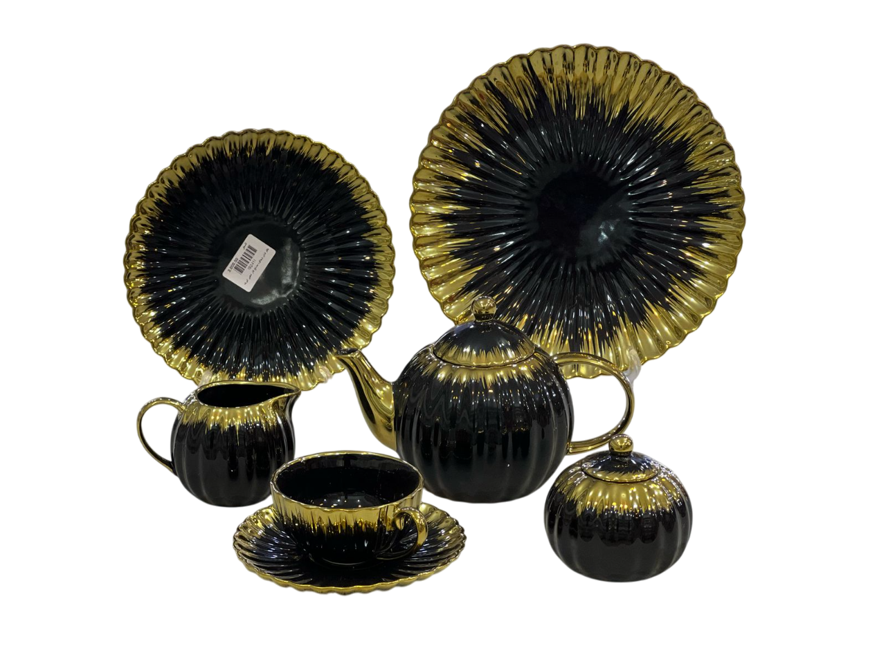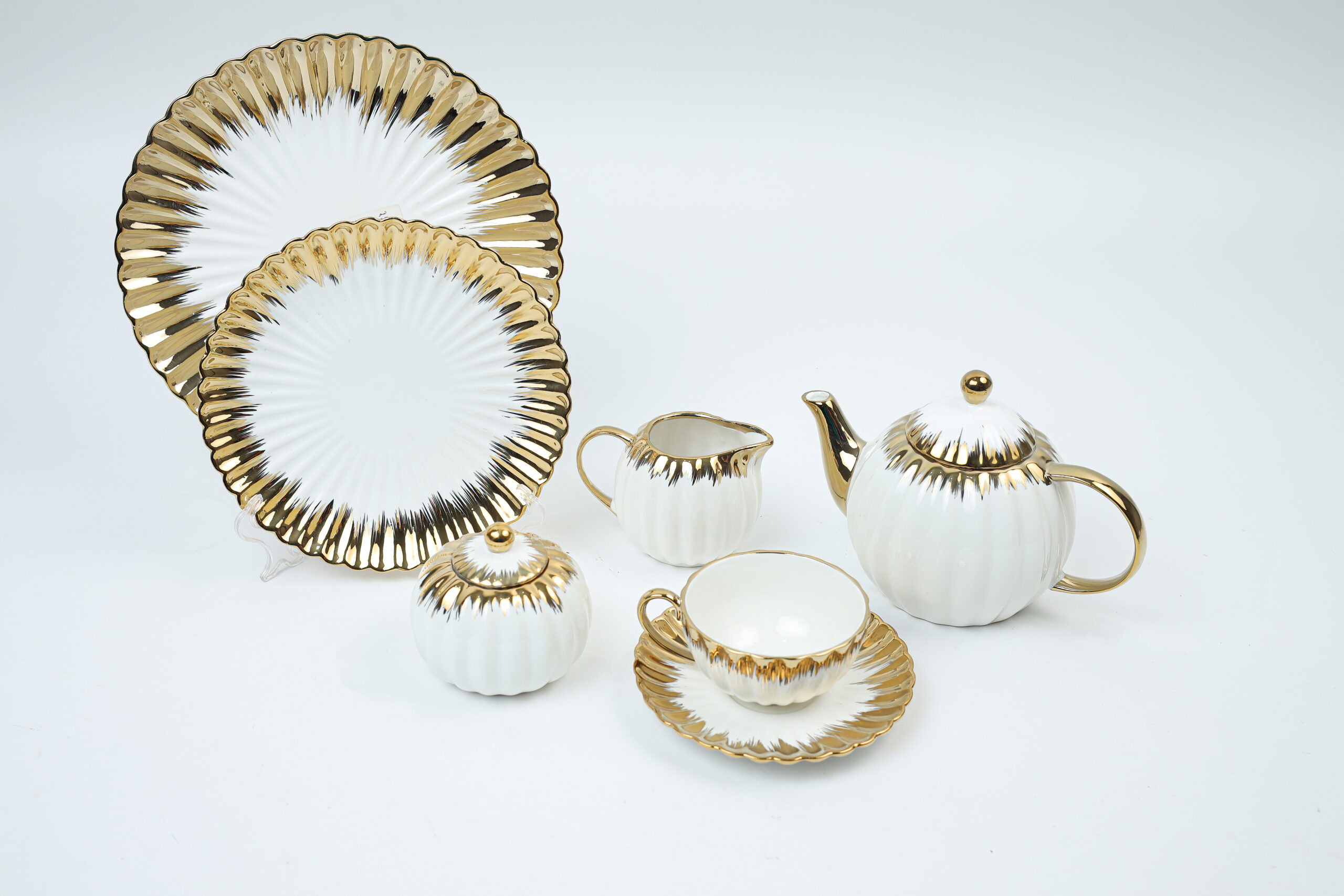 This product is a tea and cake set with a ribbed design and a gold finish. Features: High quality