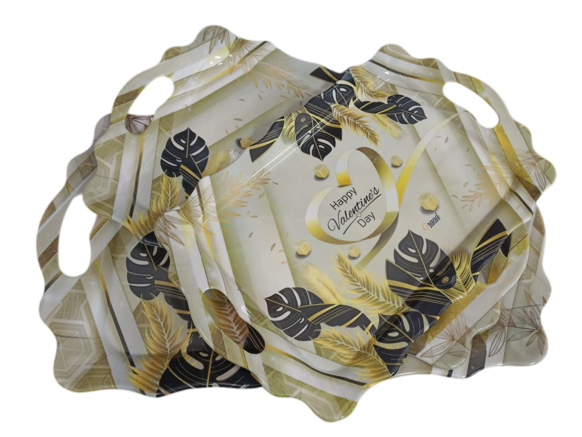 This image showcases a 3-piece nesting melamine serving tray set featuring an elegant design combining gold and black foliage.
