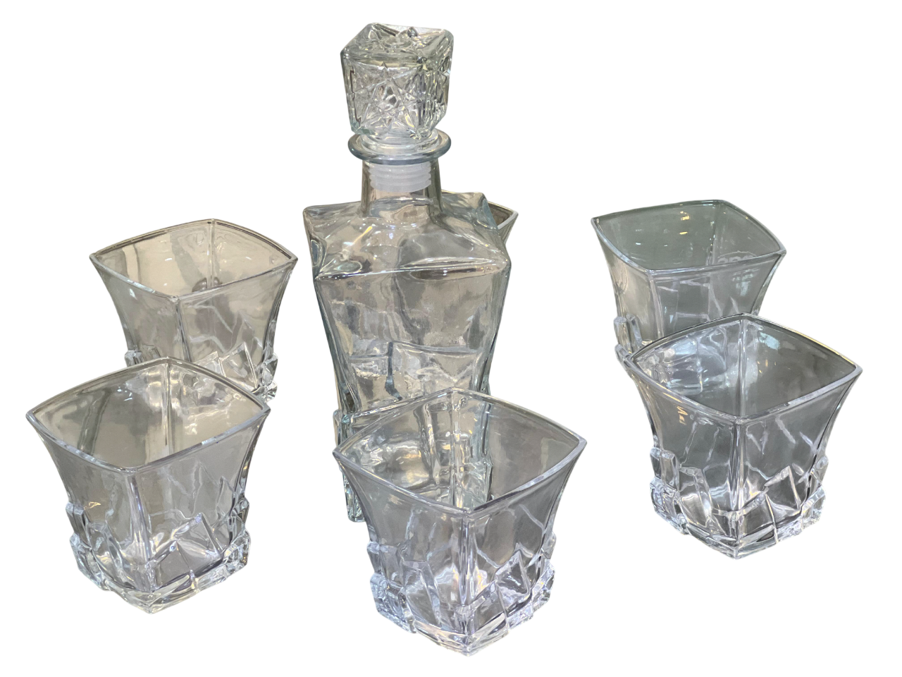 This appears to be a Bohemian Crystal Crack whiskey set, consisting of a serving jug and six glasses. Featuring a modern design with sharp angles and a base resembling cracked ice or glaciers, this set typically includes seven pieces: one serving jug and six matching “Double Old Fashion” glasses.