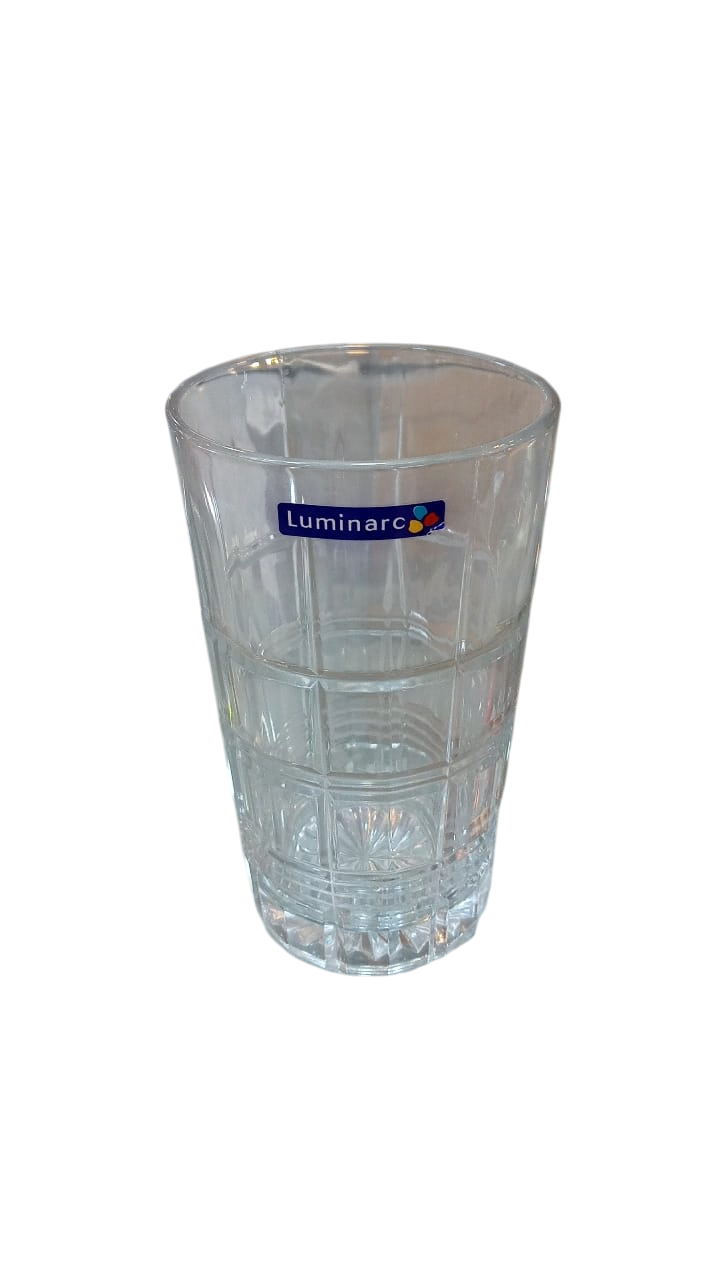 highball tumbler glass. This specific style features a classic, faceted design with a repeating square or grid pattern around the sides and base.