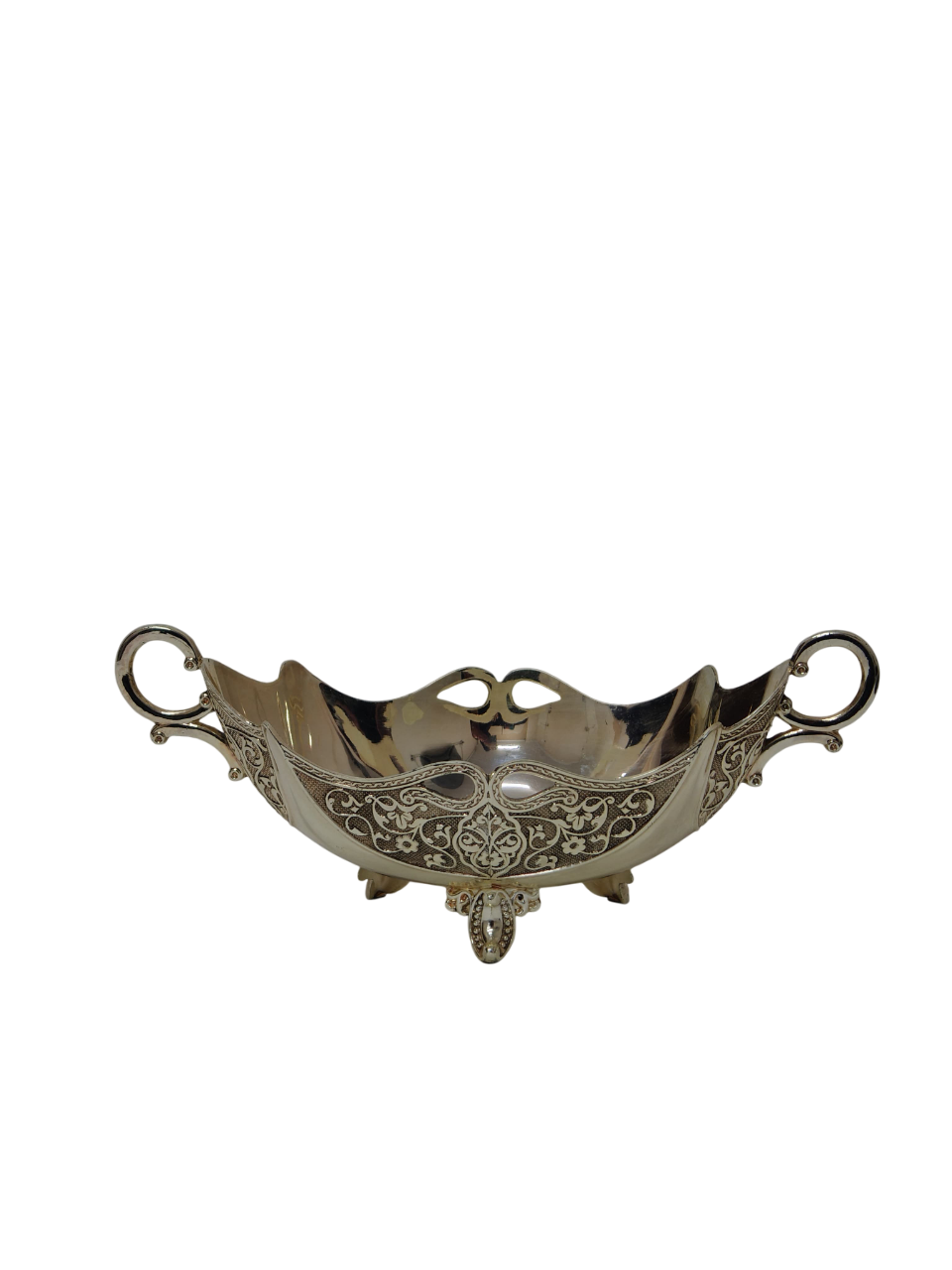 an ornate, silver-toned metal serving bowl, often referred to as a “gondola bowl” due to its elongated shape. It is a decorative piece typically used as a fruit bowl, centerpiece, or for serving dry snacks and chocolates.