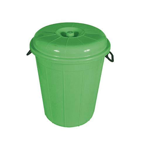 Design: Features a round body with vertical ribs for structural integrity, a secure-fitting lid, and integrated handles on the sides for portability.