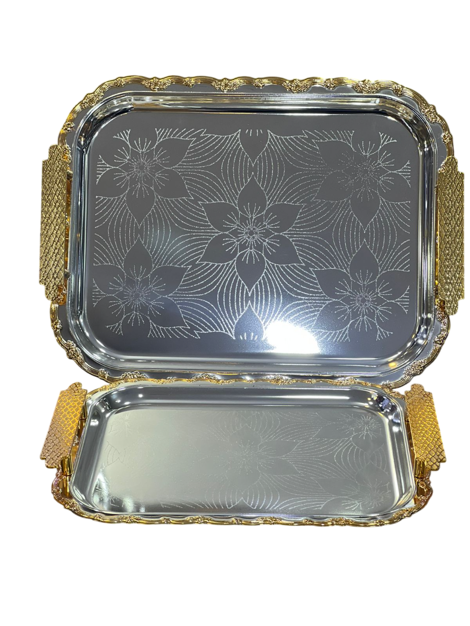 a set of luxury stainless steel serving trays.