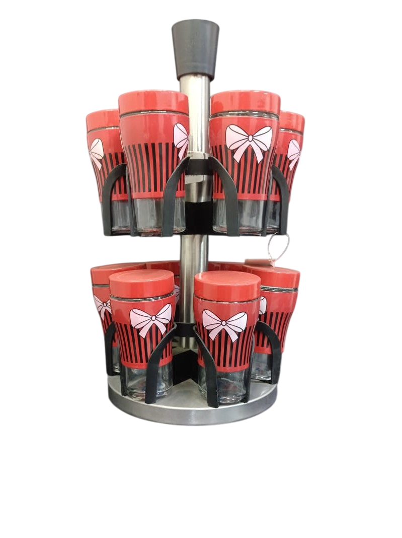 This red and black bow-shaped spice rack set for the kitchen is a rotating spice rack that includes 12 jars.