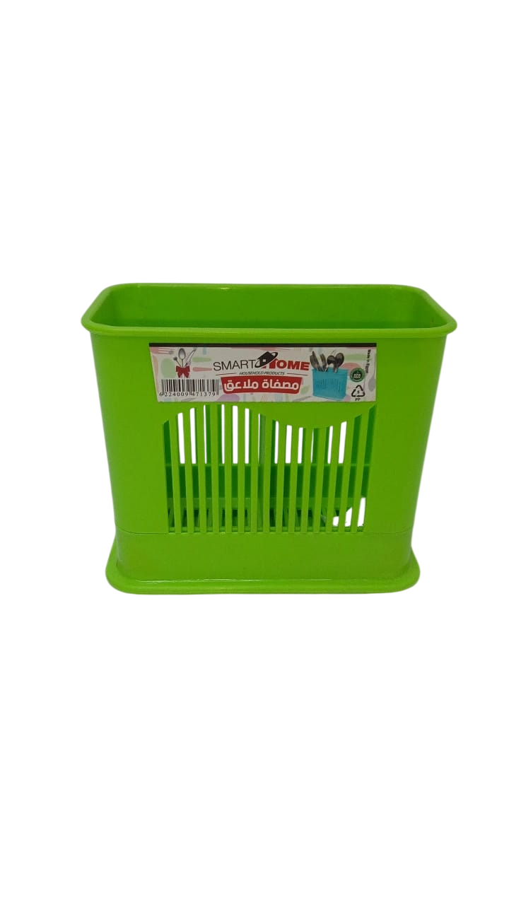 Spoon strainer: A bright green plastic organizer with longitudinal holes for draining water, designed for arranging spoons and cutlery.