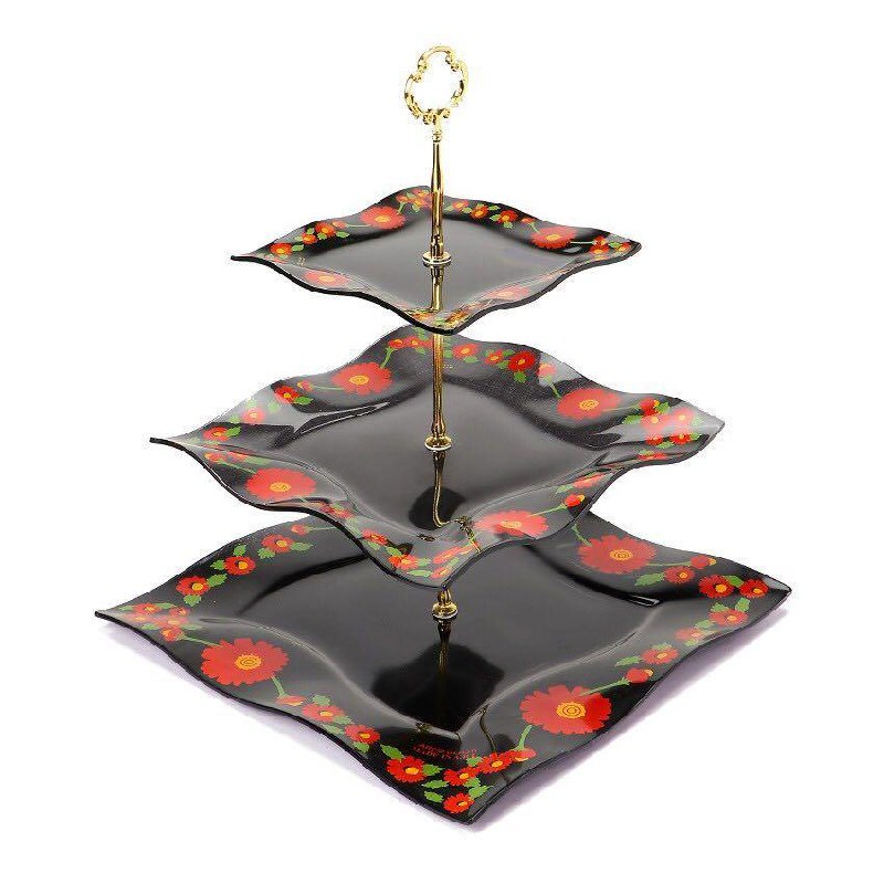 an Arcopyrex 3-tier serving tray (or carrier) featuring a glossy black finish with red floral patterns and a gold-colored handle. It is primarily designed for serving items like chocolates, cookies (kahk), or petit fours.