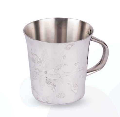 A stainless steel cup with a cone-shaped design, decorated with engraved floral or paisley patterns.