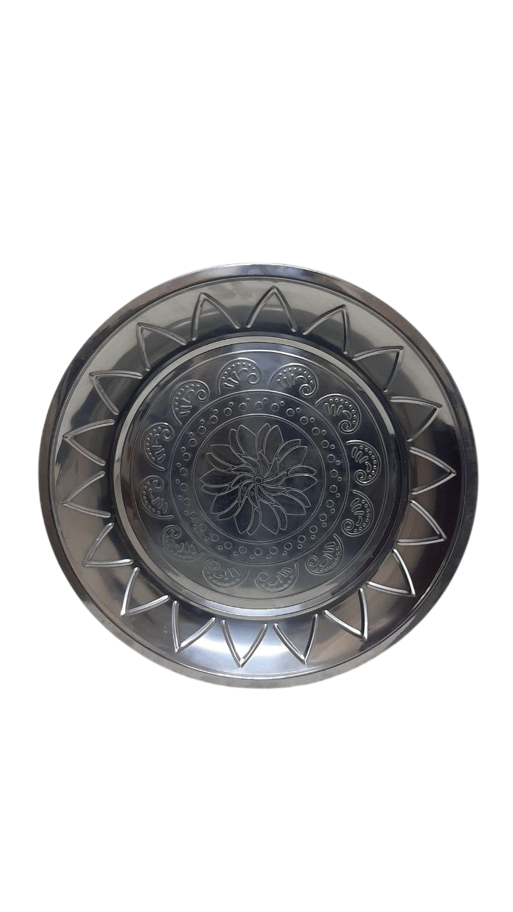 decorative, round silver-plated serving plate or platter featuring intricate embossed floral and geometric patterns. This style is commonly used for serving food or as a centerpiece for formal dining occasions.