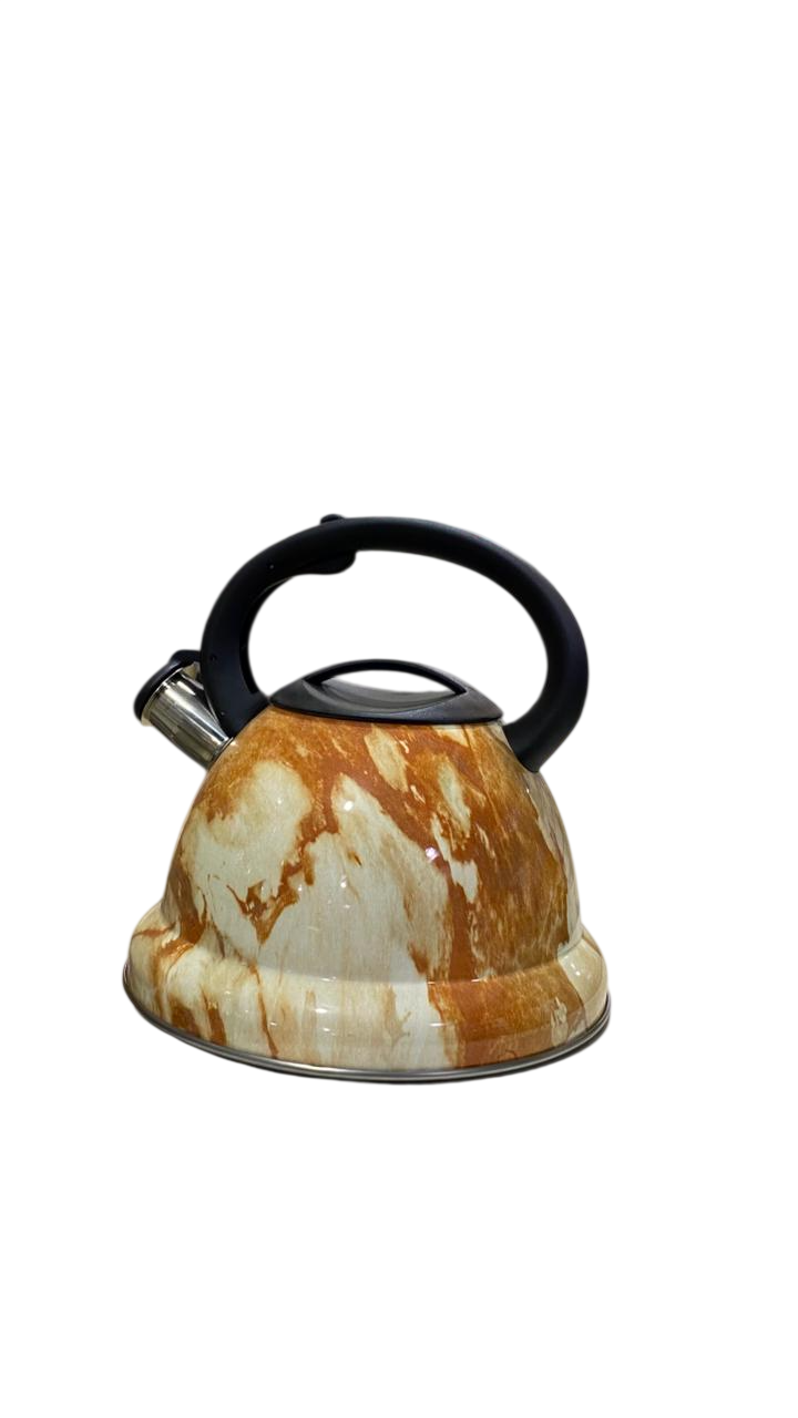 This image shows a whistling kettle, a high-quality essential appliance for stovetop use, made of durable, food-safe stainless steel. Its distinctive marble design adds a touch of elegance to modern kitchens.