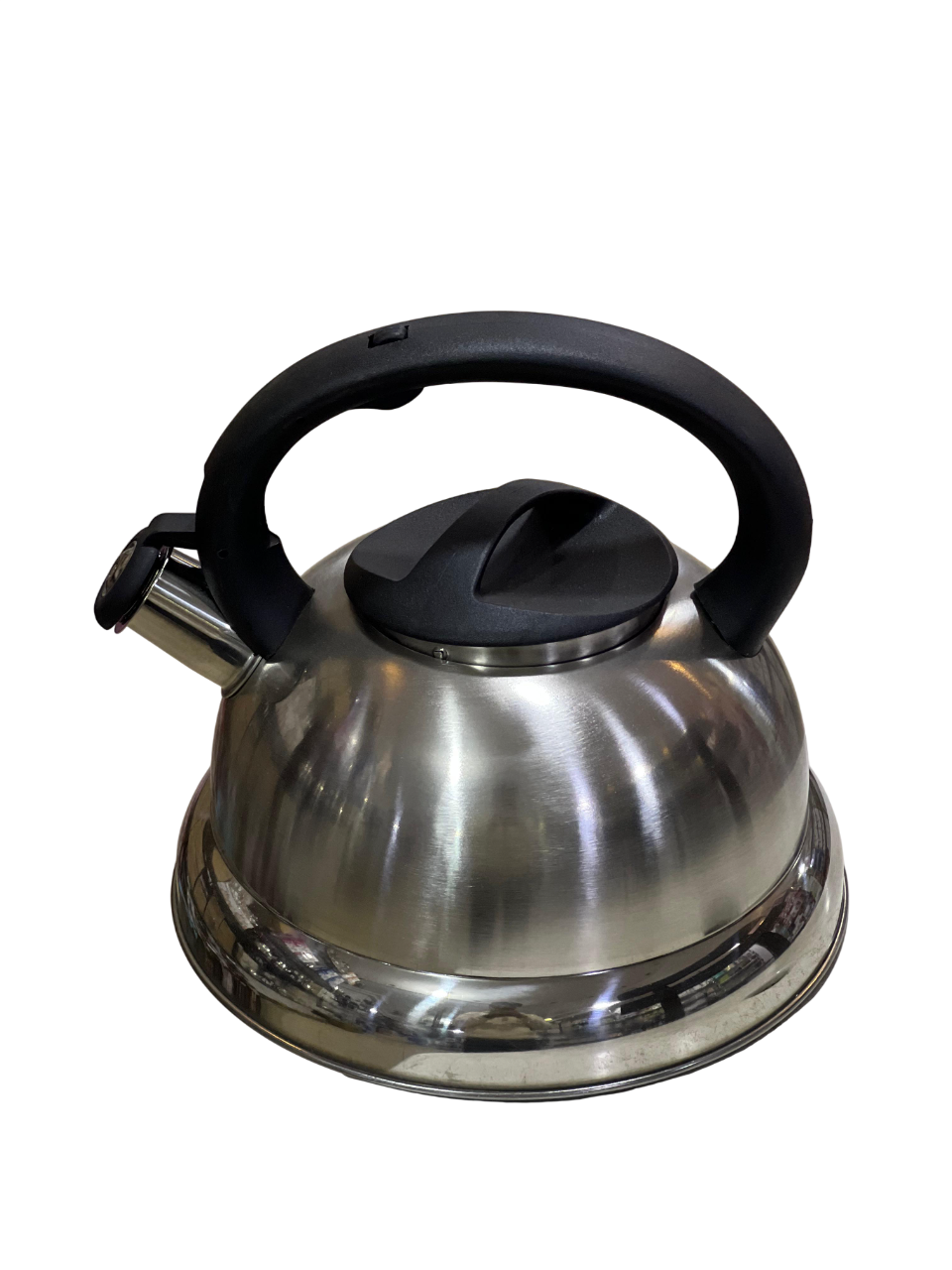 This image shows a stainless steel kettle with a whistle, a classic kitchen essential designed for boiling water on the stovetop. This kettle features a whistle on its spout that sounds when the water reaches boiling point, alerting you even from another room.