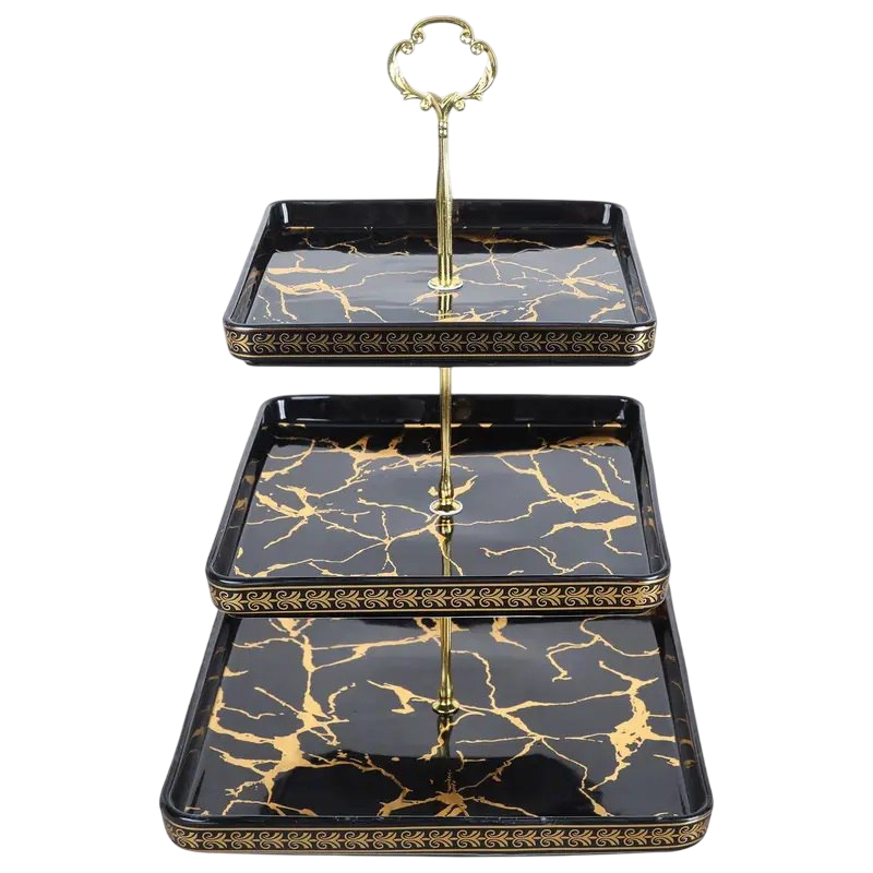 Design: The stand has three tiers of square plates with a luxurious black marble finish accented by gold veins and a patterned border. The gold-tone metal stand complements the design, making it a stylish centerpiece.