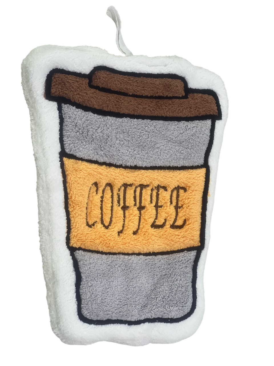 coffee-themed hanging hand towel, which is typically made from highly absorbent coral fleece, polyester, or a cotton blend. It is designed in the shape of a disposable coffee cup with an embroidered label that says “coffee”.