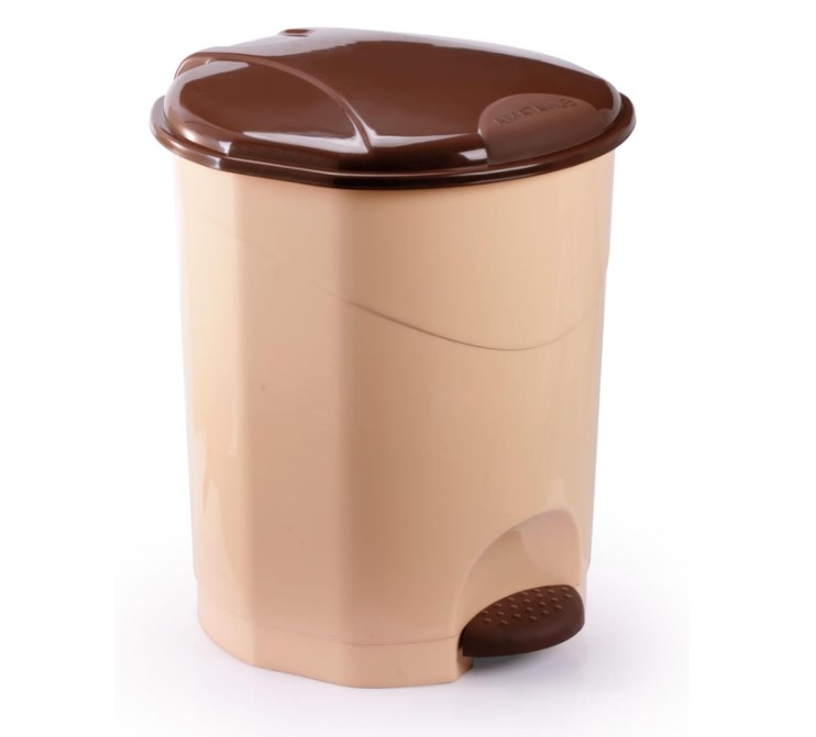 plastic pedal trash bin or a similar style of dustbin. It features a hygienic, hands-free operation and a two-tone beige and brown color scheme.