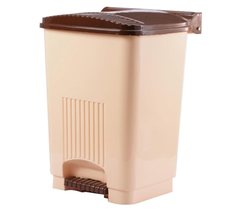 plastic pedal trash can, also commonly referred to as a pedal bin or waste bin. The bin has a beige body with a contrasting brown lid and pedal. It is a practical and hygienic solution for waste disposal in various settings.