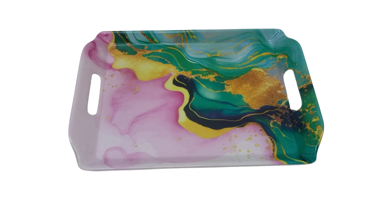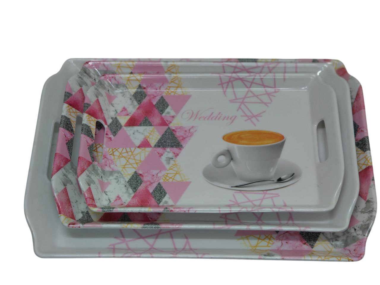 Design: Features a modern, geometric pattern in shades of pink, gray, and gold, resembling marble and abstract lines. The text “Wedding” is visible on the largest tray. They have integrated handles and slightly curved edges for easy carrying.