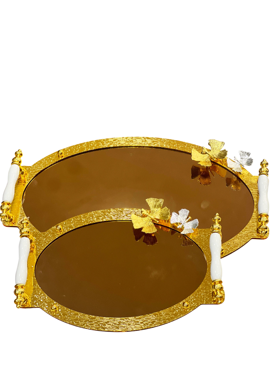 Design: Features an oval design with decorative edges and small butterfly or flower-shaped lids in gold and silver. The side handles are white with gold accents, and the base is mirrored in gold.